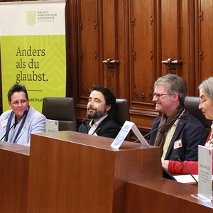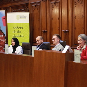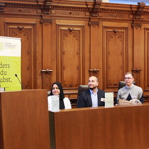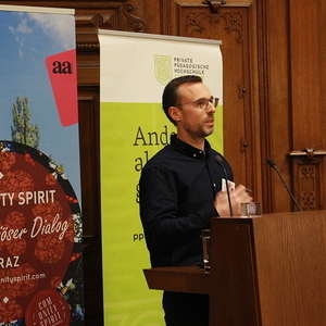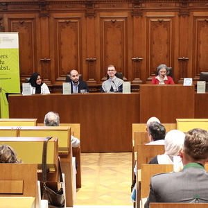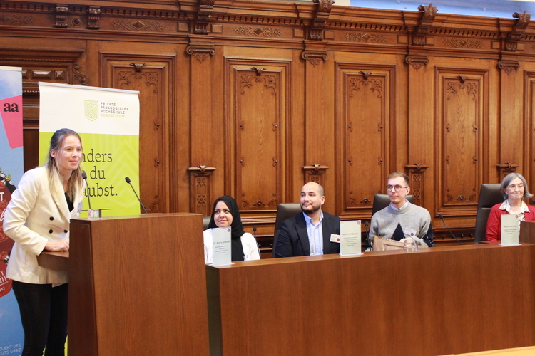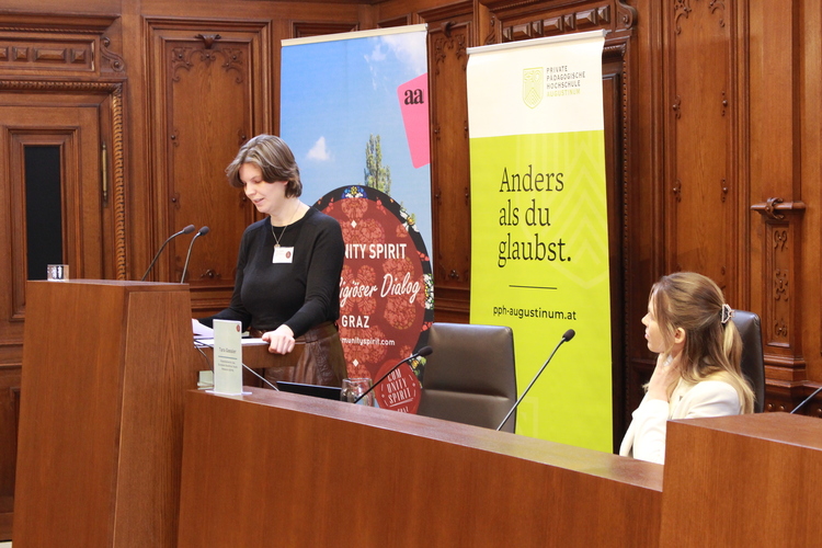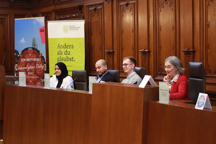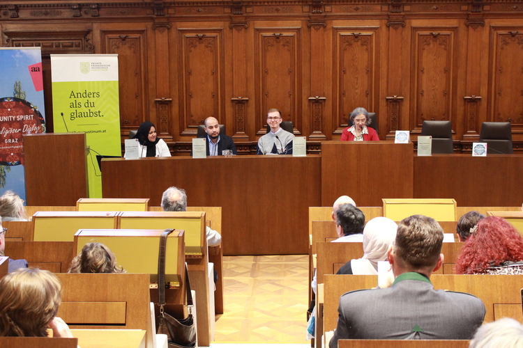 Schließlich folgten zwei Podiumsdiskussionen zur Frage nach demokratischen Strukturen und Grundsätzen innerhalb von Religionsgemeinschaften. Muslimischerseits erläuterten Mehmet Celebi (Vorsitzender der Islamischen Religionsgemeinde Steiermark), Amira Sharawi (islamische Religionspädagogin) und Andin Berisha (Muslimische Jugend Österreich) Mitbestimmungsmöglichkeiten in ihrer Community. Christlicherseits stellten sich Ioan Moga (orthodoxer Theologe, Universität Wien), Matthias Weigold (evangelischer Pfarrer, Heilandskirche Graz) und Anna Hollwöger (Generalsekretärin der Katholischen Aktion, Diözese Graz-Seckau) ehrlich und offen den Fragen nach den jeweiligen Vor- und Nachteilen demokratischer und hierarchischer Kirchensysteme.